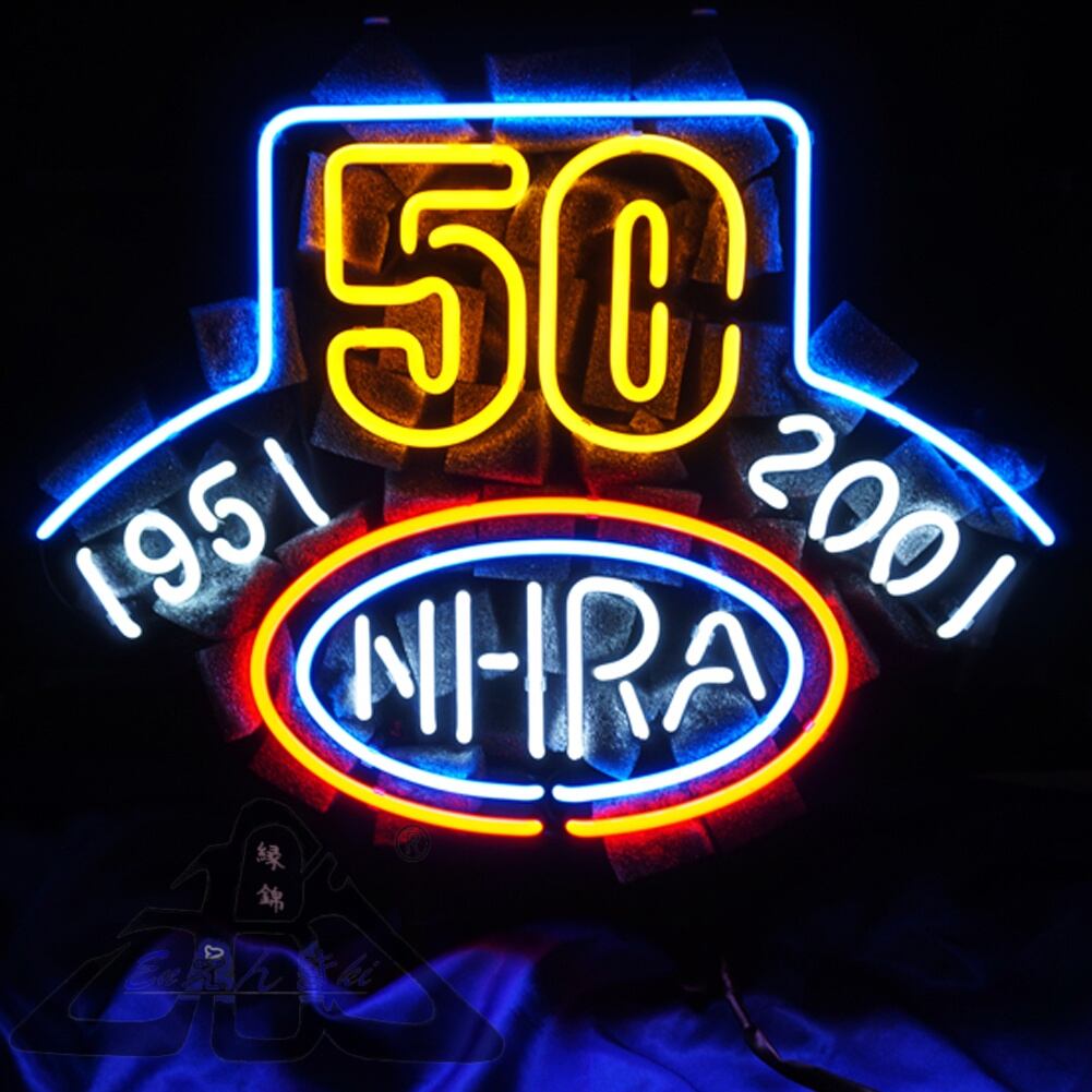 ・NHRA(全米ホットロッド協会)設立50周年を記念した特別デザインのガラスネオンサイン。1951〜2001年を象徴する光のアートで、レーシングファン必見のアイテムです。