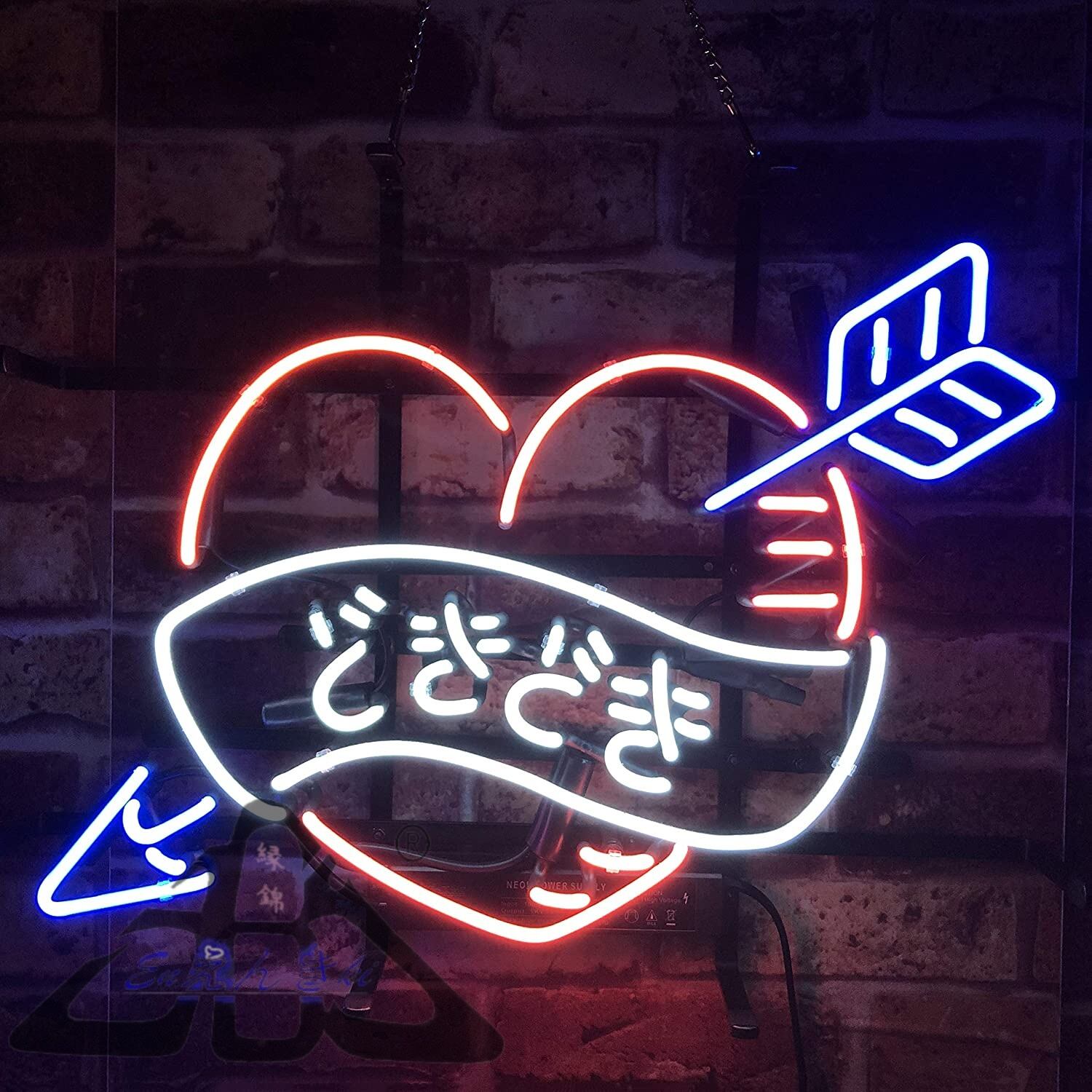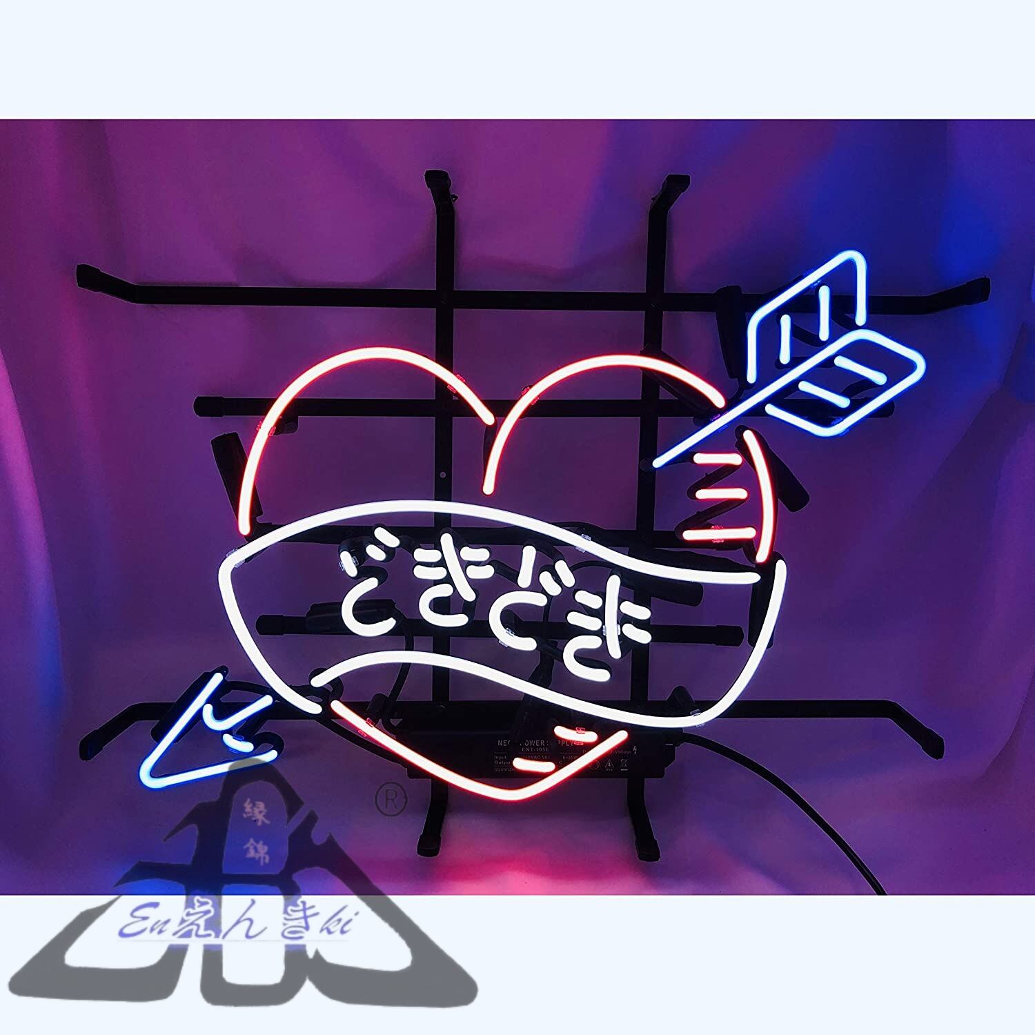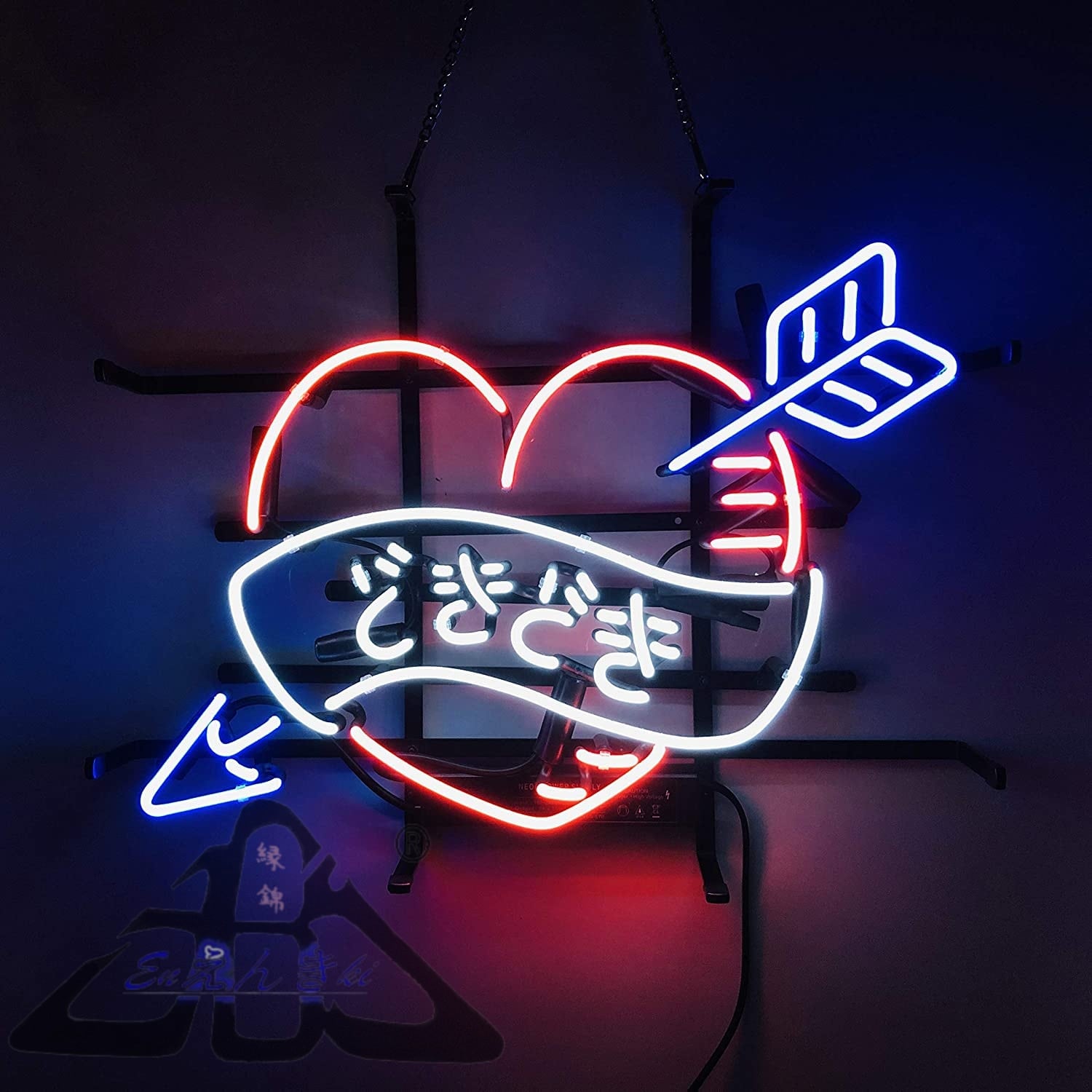 赤いハートにブルーの矢が刺さり、中央には「どきどき」の文字が光るユニークなガラス管ネオンサイン。恋愛・ときめきを表現した特別感のあるデザインです。