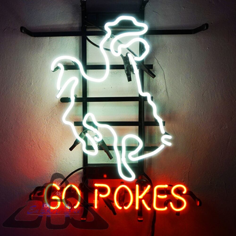 ・カウボーイのシルエットと「GO POKES」の文字を組み合わせたガラスネオンサイン。ホワイトとレッドのコントラストが力強く、アメリカ西部を思わせる雰囲気を演出します。